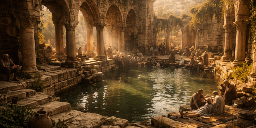 A narrativa bíblica posiciona o Tanque de Betesda, cujo nome significa 'Casa de Misericórdia', nas proximidades da Porta das Ovelhas, em Jerusalém. Este local era conhecido por abrigar uma vasta multidão de enfermos — cegos, coxos e paralíticos — que aguardavam um evento peculiar: a agitação das águas. A crença popular, conforme o texto, indicava que o primeiro a mergulhar no tanque após a movimentação da água seria curado, atribuindo o fenômeno à ação esporádica de um anjo. Arqueologicamente, escavações em Jerusalém revelaram a existência de dois tanques adjacentes e de cinco pórticos, corroborando a descrição bíblica de um local de cura e peregrinação.